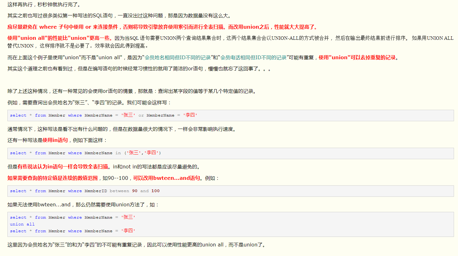 4.在where子句中使用 or 来连接条件:应使用UNION 或 UNION ALL