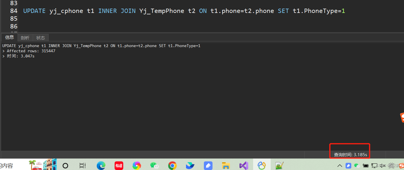 其中Yj_CPhone有1500万数据,Yj_TempPhone有31万数据,语句执行时间超过半个小时还没有执行完。