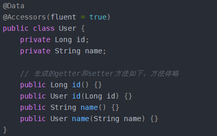 1、fluent:流畅的,设置为true,getter和setter方法的方法名都是基础属性名,且setter方法返回当前对象