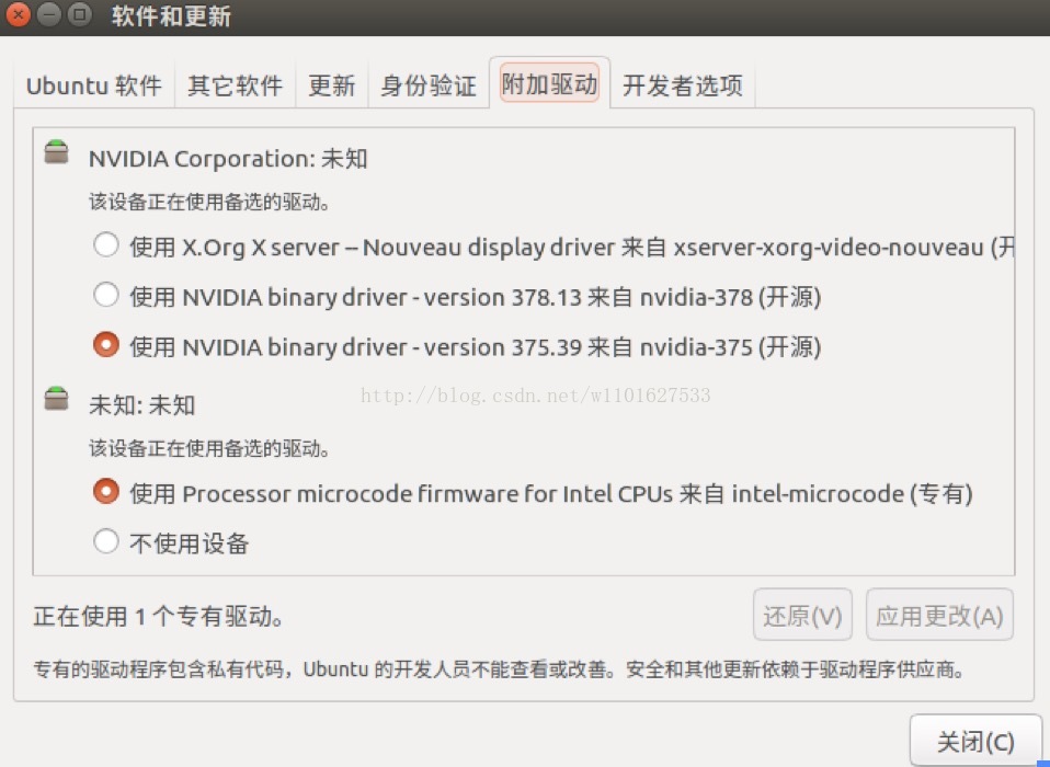安装后可在系统设置》软件和更新》附件驱动中发现可用的NVIDIA显卡驱动程序如下图: