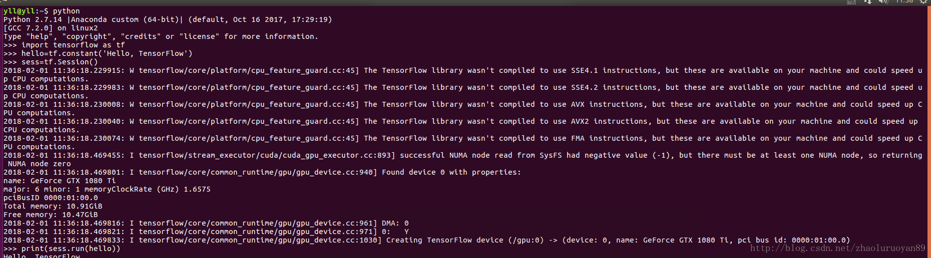 print(sess.run(hello))打印出 Hello, TensorFlow 就是正确安装,见下图