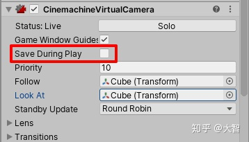 如上图,在任意一个Virtual Camera上勾选Save During Play可以启用保存运行时修改的功能。这是一个全局的属性,不需要每个相机单独设置,只要在一个Virtual Camera上勾选或者取消勾选即可。