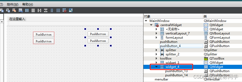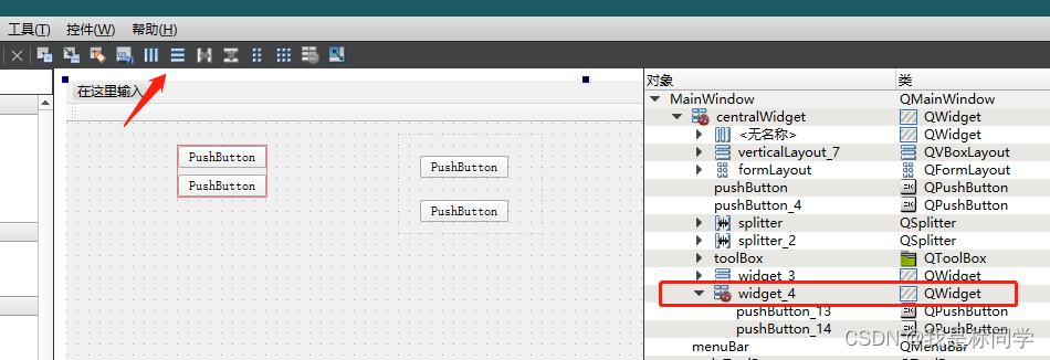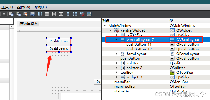 先拖入一个QWiget,然后拖两个按钮进去,再选中这个QWiget,给它选择一个布局器即可。我们可以看到是这个widget具有了QVBoxLayout的属性(应该时widget多继承了它),此时这个widget自己仍然直接作为父控件的,容纳了两个按钮子控件的。而且这个布局效果是没有那个红色的边框线的。(注意:这个方式2和方式1产生的布局器,再拖到一个widget中,产生出的效果是不一样的,因为相当于这个widget添加了一个子控件而已,这里的子控件就是QVBoxLayout对象)