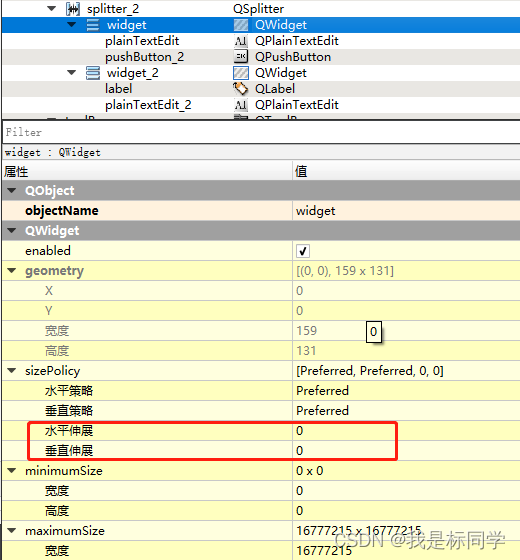 如何调整被分割子控件之间的初始比例???网上很多博客是用代码实现,即setStretchFactor函数,其实不需要的。这些子控件,只要是继承自QWiget的,都有 水平伸展 垂直伸展 策略即sizePolicy的,只要给这些子控件设置这个参数值为非零值,就能按照比例进行产生效果了(注意,需要运行才能看到效果,或者菜单栏选择预览功能也行,快捷键shift+alt+r,如果仍然不能奏效,把这个比例设得很大一个数,比如100,就能看到效果了)。所以这就是为什么我推荐上面用方式2布局的原因,因为方式2得到的是QWidget,所以如果作为QSpliter的子控件,就可以设置这个值了,如果是方式1得到的QVBoxLayout对象,就没有这个值可设,当然网上有人说此情况下通过代码也可以设置,大家可以试试 QTQSplitter设置初始比例setStretchFactor失效解决 - 百度文库。