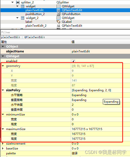 - sizePolicy:这个很重要,父控件发生压缩或者拉伸的时候,控制本控件的变化效果的(这个参数会跟布父控件中的兄弟控件进行比较的)。比如是Expanding,那么拉伸时候,自己就会同样被拉伸,如果是Preferred,就是自适应,比如兄弟控件的属性都是Fixed,那么它就能得到拉伸,如果别人都是Expanding,那么就拉伸不过别人了