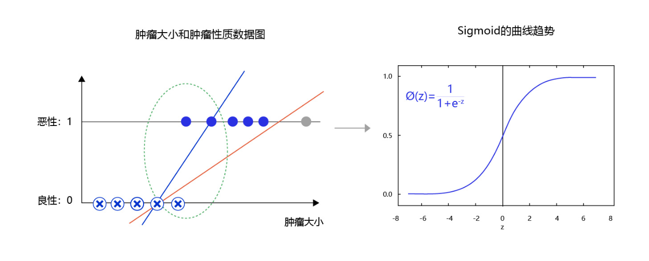 图5 是肿瘤大小和肿瘤性质的数据图。从图中可发现,往往尺寸越大的肿瘤几乎全部是恶性,尺寸极小的肿瘤几乎全部是良性。只有在中间区域,肿瘤的恶性概率会从0逐渐到1(绿色区域),这种数据的分布是符合多数现实问题的规律。如果我们直接线性拟合,相当于红色的直线,会发现直线的纵轴0-1的区域会拉的很长,而我们期望拟合曲线0-1的区域与真实的分类边界区域重合。那么,观察下Sigmoid的曲线趋势可以满足我们对这个问题的一切期望,它的概率变化会集中在一个边界区域,有助于模型提升边界区域的分辨率。
