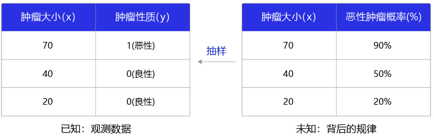 在本案例中,医生根据肿瘤大小 x x x作为肿瘤性质 y y y的参考判断(判断的因素有很多,肿瘤大小只是其中之一),那么我们观测到该模型判断的结果是 x x x和 y y y的标签(1为恶性,0为良性)。而这个数据背后的规律是不同大小的肿瘤,属于恶性肿瘤的概率。观测数据是真实规律抽样下的结果,分类模型应该拟合这个真实规律,输出属于该分类标签的概率。
