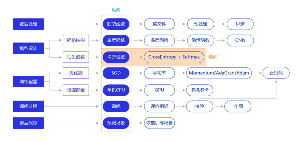 上一节我们尝试通过更复杂的模型(经典的全连接神经网络和卷积神经网络),提升手写数字识别模型训练的准确性。本节我们继续将“横纵式”教学法从横向展开,如 图1 所示,探讨损失函数的优化对模型训练效果的影响。