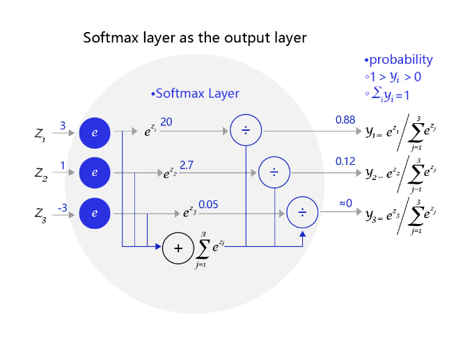 图3 是一个三个标签的分类模型(三分类)使用的softmax输出层,从中可见原始输出的三个数字3、1、-3,经过softmax层后转变成加和为1的三个概率值0.88、0.12、0。