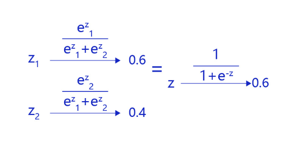 对于二分类问题,使用两个输出接入softmax作为输出层,等价于使用单一输出接入Sigmoid函数。如 图4 所示,利用两个标签的输出概率之和为1的条件,softmax输出0.6和0.4两个标签概率,从数学上等价于输出一个标签的概率0.6。
