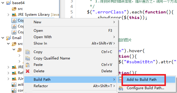 3.右键点击jar包文件,选择Build Path,选择 add to build path 把jar包添加进去!