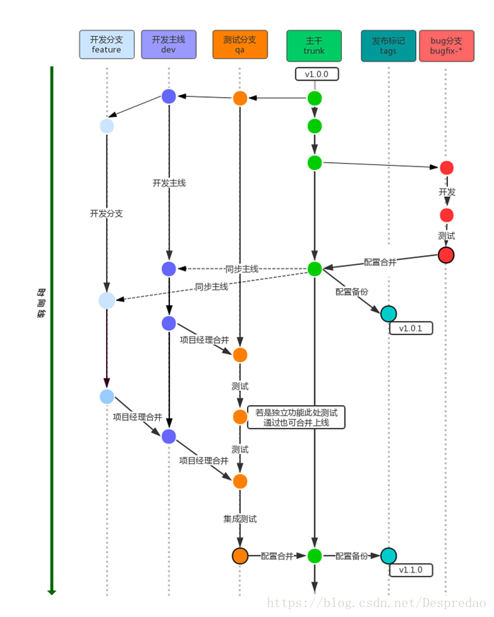 - 开发在功能完成时由项目经理合并到qa测试分支并通知配置管理发布测试,配置管理在发布测试并打上测试tags