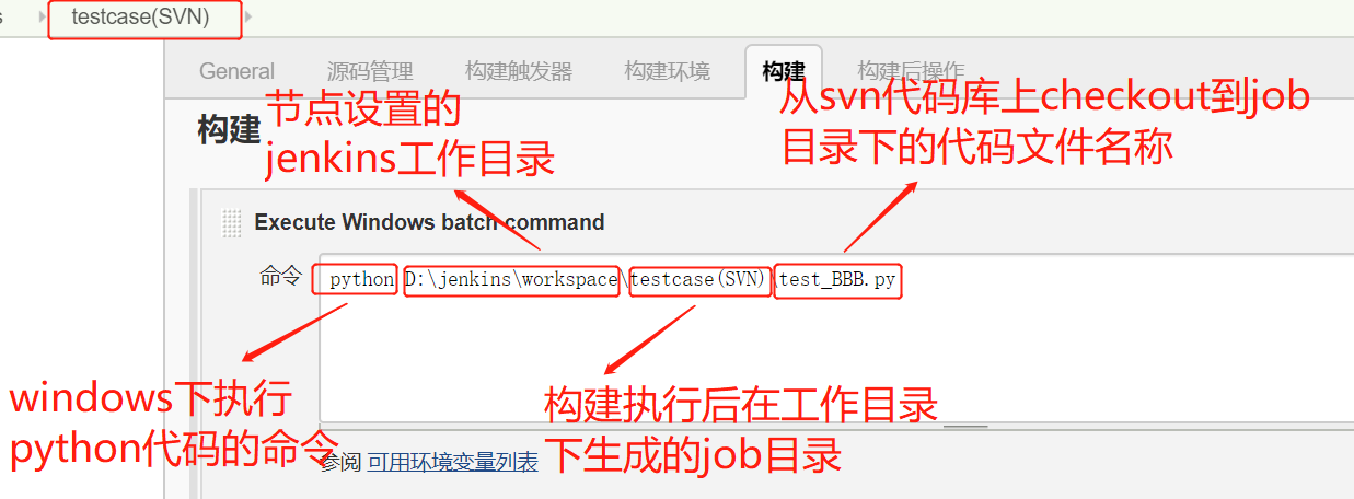 3.配置构建(我用的是 windows 命令构建,路径对应之前设置的 jenkins 自定义工作空间即可,因为当 SVN 源码更新,自定义的工作空间内的内容也会更新,所以这样每次 Jenkins 所执行的代码都是svn中最新的)
