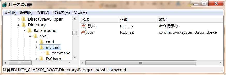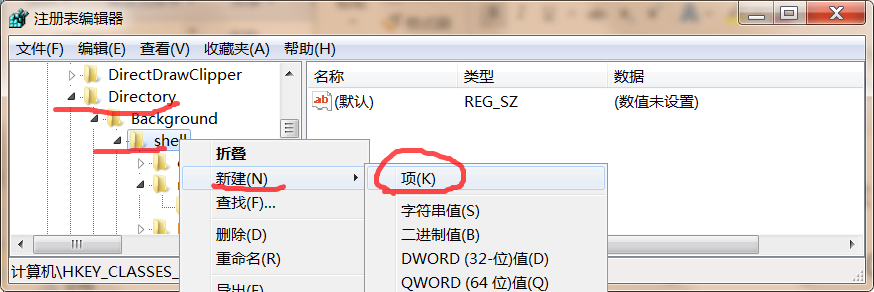 鼠标右击 shell 新建 -> 项,输入添加右击菜单的名字,我以“mycom”为例。