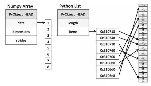 c). Python 的对象模型会导致访问内存效率变低。Numpy 的指针指向缓存区数据的值,而 Python 的指针指向缓存对象,再通过缓存对象指向数据: