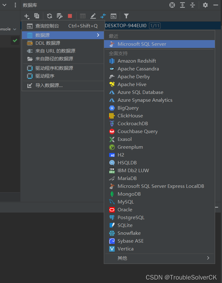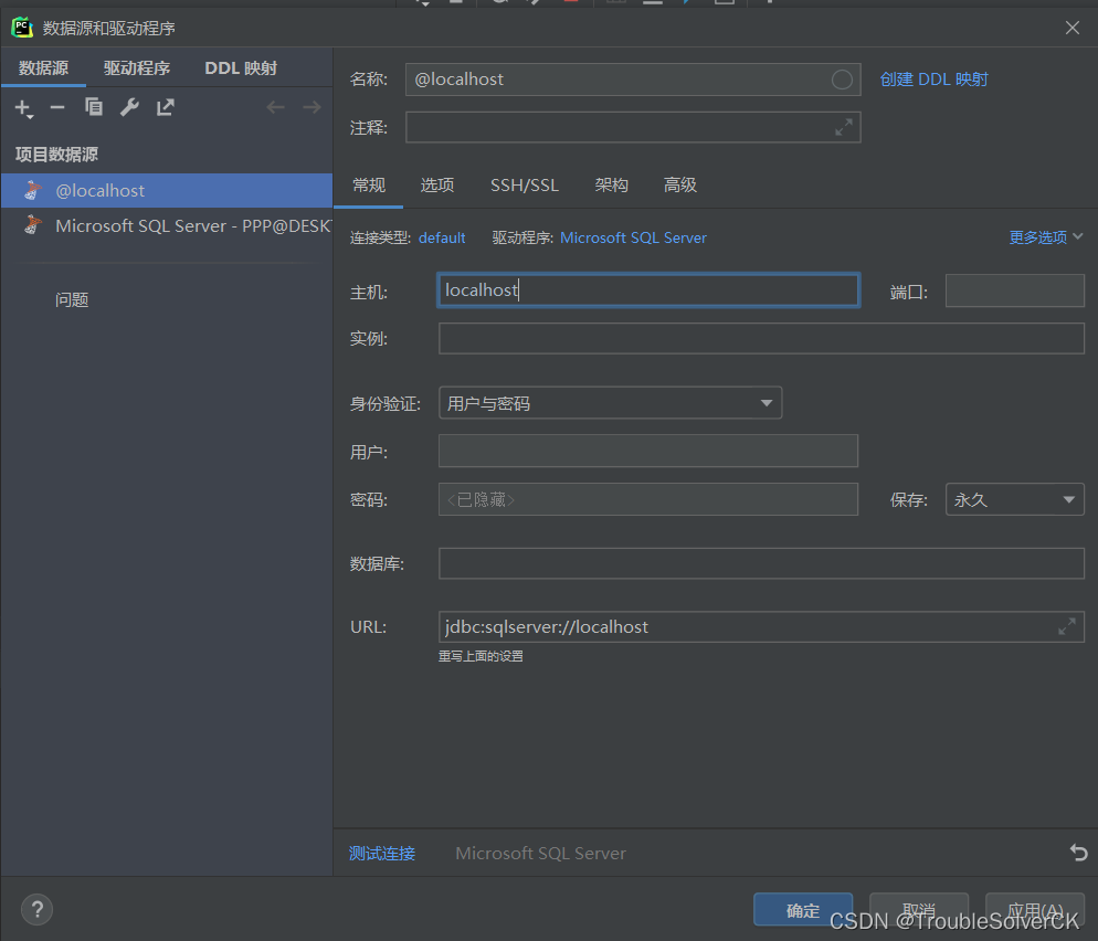 以上就是迷路夏天最近收集整理的关于Pycharm连接SQLSever1.视图->工具窗口->数据库 右侧会跳出一个窗口2.点击加号3.数据源 ->Microsoft SQL Sever的全部内容,更多相关Pycharm连接SQLSever1.视图->工具窗口->数据库内容请搜索靠谱客的其他文章。