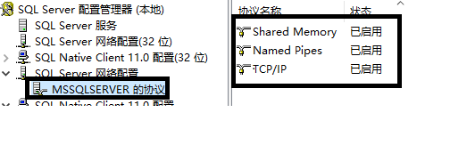 (1)、首先,打开SQL SERVER配置管理器->SQL Server 网络配置->MSSQLSERVER的协议,确保右侧的三个协议都为“已启用状态”。如图1所示: