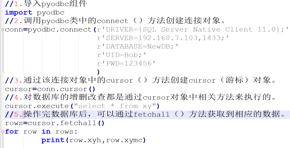 这里注意以下connect()方法中传入的字符串参数,该字符串参数应该包含五个个重要的信息:DRIVER、SERVER、DATABSASE、UID、PWD。其中DRIVER={相应的数据库版本字符串号}是对应于不同版本的SQL Server数据库,具体的参见官方ADODBAPI,由于我的数据库为2012版本,因此{}中为:“SQL Server Native Client 11.0 ”,server="服务器名",DATABASE="数据库名"",UID="用户名",PWD="登陆密码"。