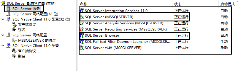 然后,点击SQL SERVER 服务,确保如图2右侧的服务是处于运行状态,如果不是,则开启。