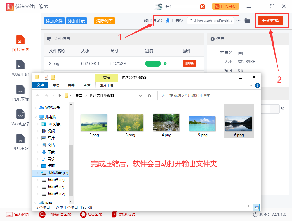 第三步,先设置输出目录文件夹,用来保存压缩后的照片;最后点击右边的红色按钮启动照片压缩,完成压缩后软件会自动打开输出文件夹,方便我们查看压缩后的照片。