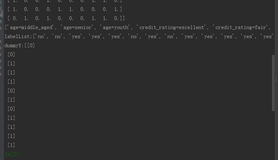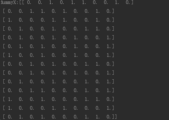 dummyX=vec.fit_transform(featureList).toarray() #转换0,1,scikit库可以识别