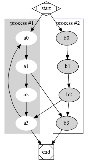 /home/tong/Src/copyright/onescorpion/chimpanzee/doc [git::master *] [tong@T7] [15:36] > cat test.gv digraph G { subgraph cluster0 { node [style=filled,color=white]; style=filled; color=lightgrey; a0 -> a1 -> a2 -> a3; label = "process #1"; } subgraph cluster1 { node [style=filled]; b0 -> b1 -> b2 -> b3; label = "process #2"; color=blue } start -> a0; start -> b0; a1 -> b3; b2 -> a3; a3 -> a0; a3 -> end; b3 -> end; start [shape=Mdiamond]; end [shape=Msquare]; }