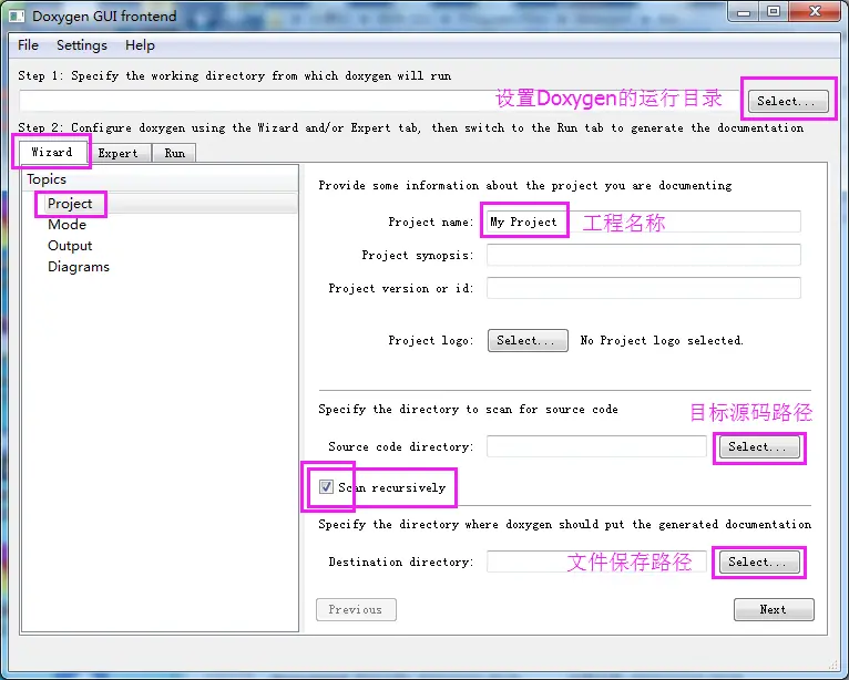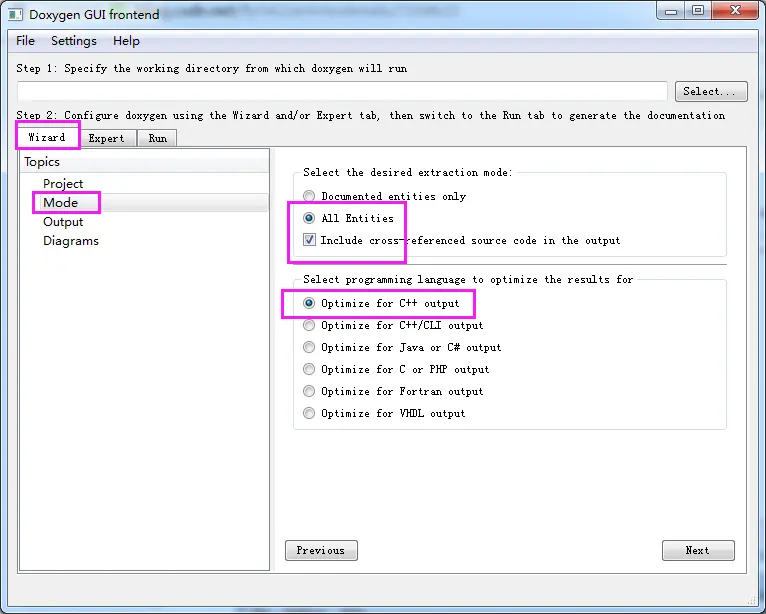 2、运行DoxyWizard,弹出Doxygen配置界面