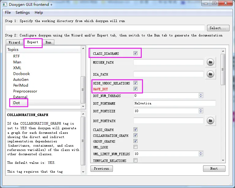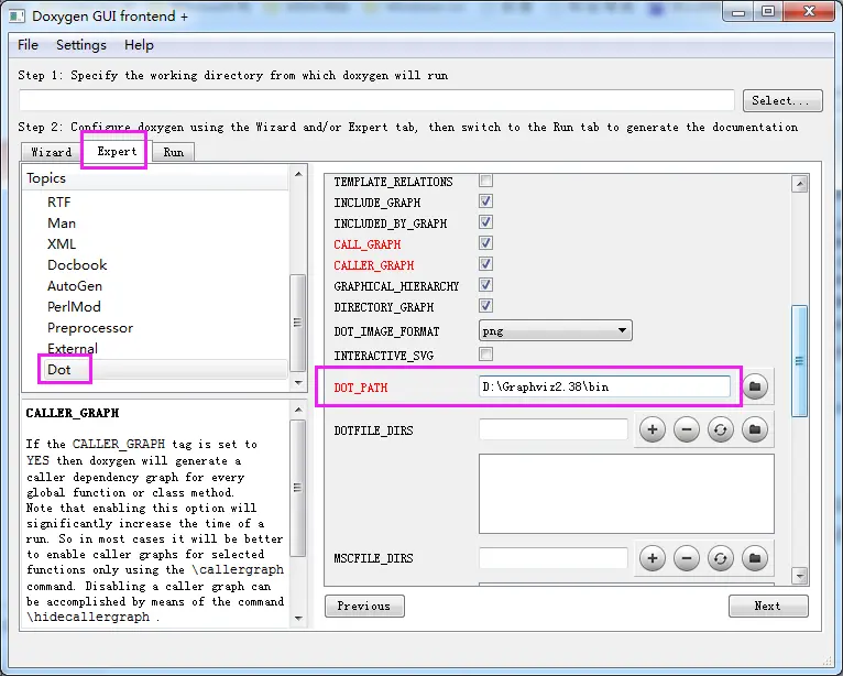 由于使用到了Graphviz,所以要设置Dot选项,勾选HAVE_DOT,并设置DOT_PATH为Graphviz的bin目录。(注意:MAC的Graphviz的bin目录不在安装包内,一般是在/usr/local/bin/,实在找不到就到终端用ls一层一层的查找)