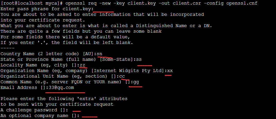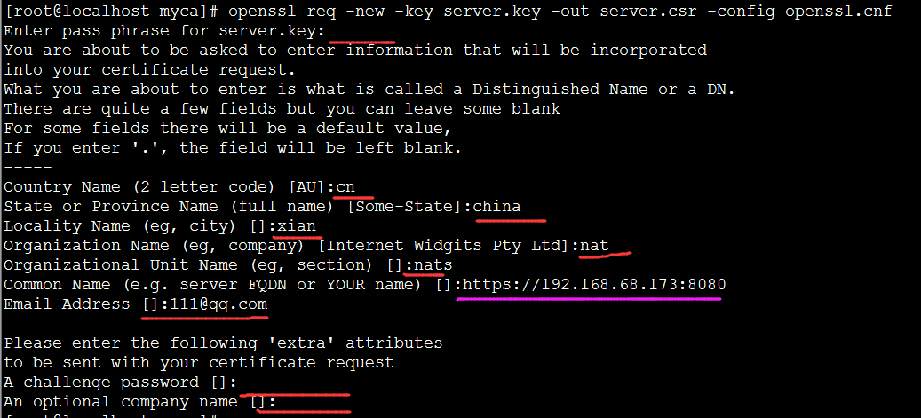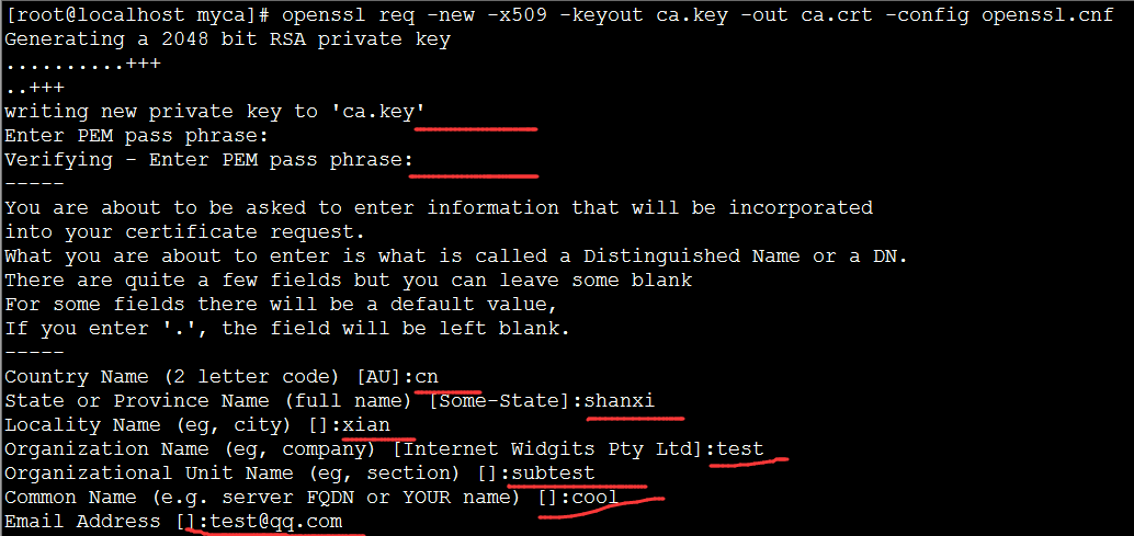 生成会话会让你填入一些参数,红线标出的是要输入的,根据实际情况填写。执行完会发现工作目录下会有ca.crt ca.key两个文件。截图如下: