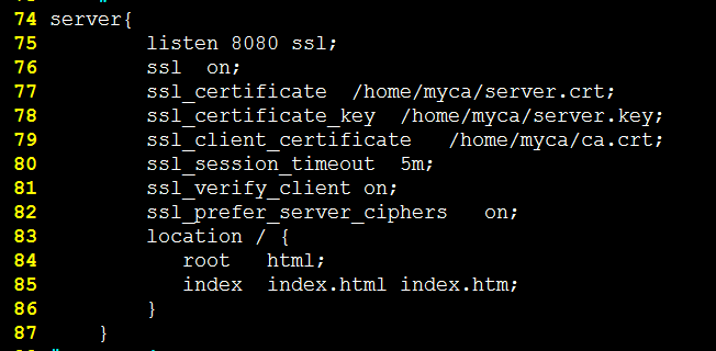 配置nginx:vi /usr/local/nginx/conf/nginx.conf修改配置如下图(注意证书和CA的路径是我的工程路径):