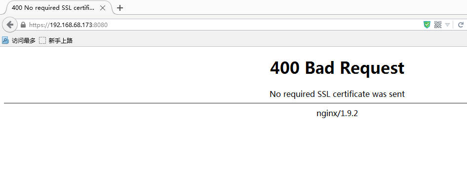 看见中间那行提示了吗?中式英语翻译过来就是-->没有要求的ssl证书来发送。也就是说,client已经成功认证了server端的证书,但是我们配置nginx为双向认证,所以nginx要求浏览器出示证书,而浏览器没有证书。