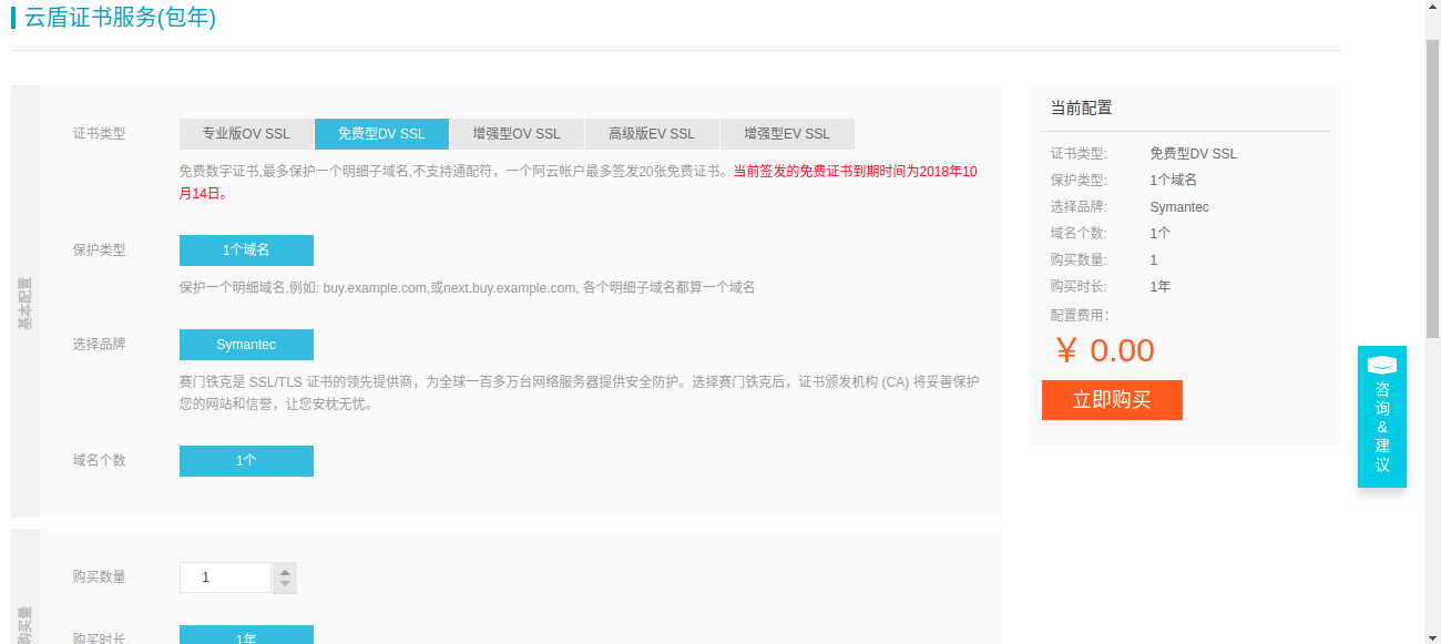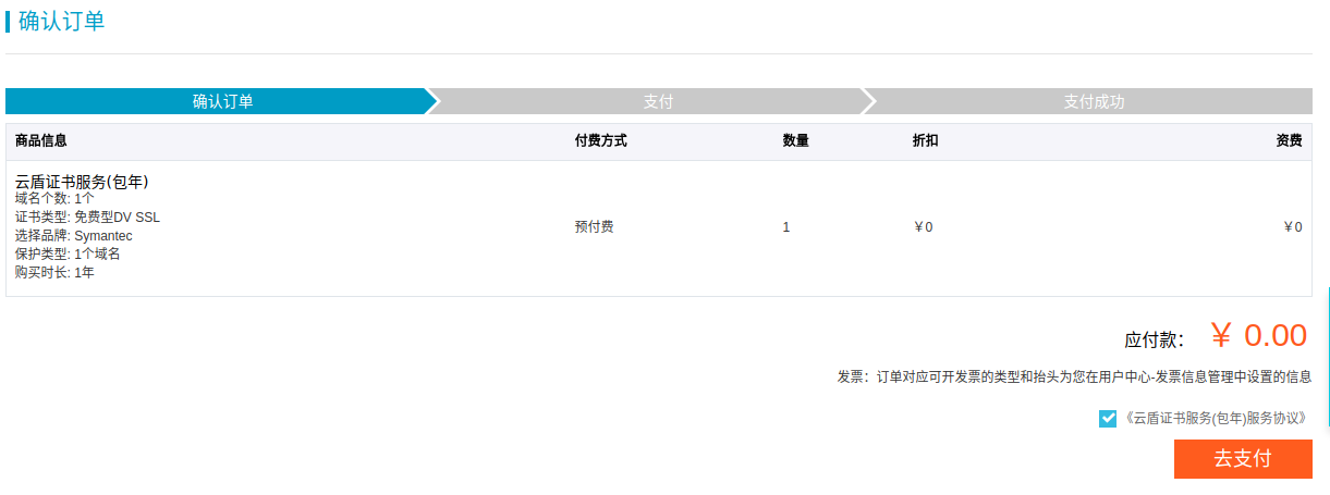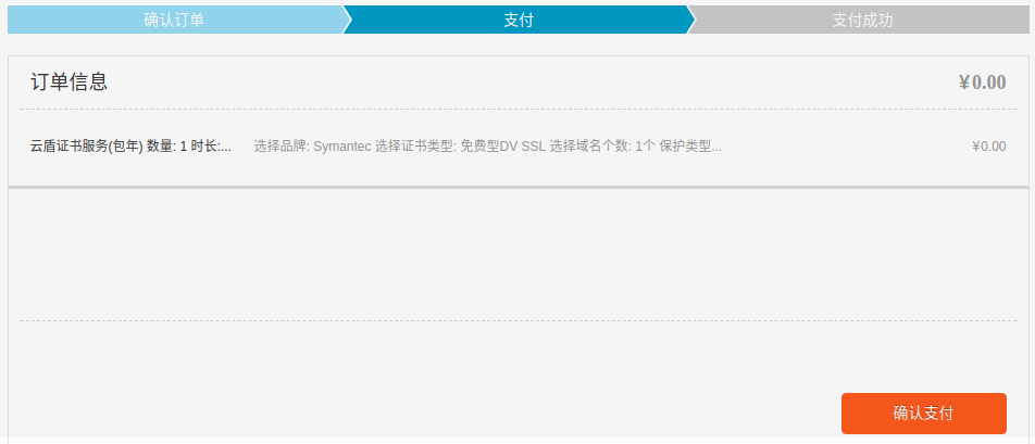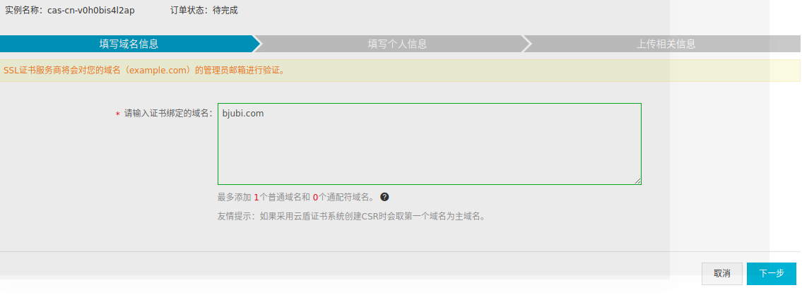 说明:因为我们这里申请的是开发版免费证书,所以一个证书仅支持一个域名认证,不支持通配符。