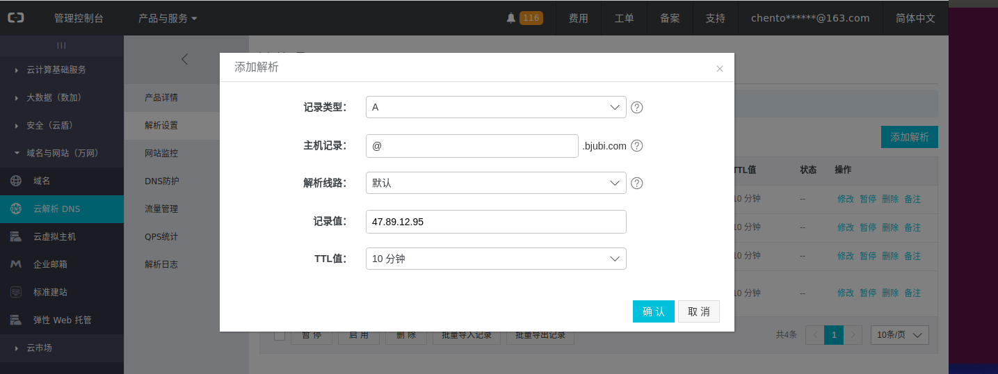 在阿里云控制台-产品与服务-云解析DNS-找到需要解析的域名点“解析”,进入解析页面后选择【添加解析】按钮会弹出如下页面:
