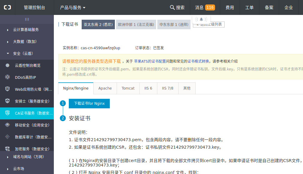 进入下载页面,找到ngin页签中nginx配置信息,并“下载证书 for Nginx”: