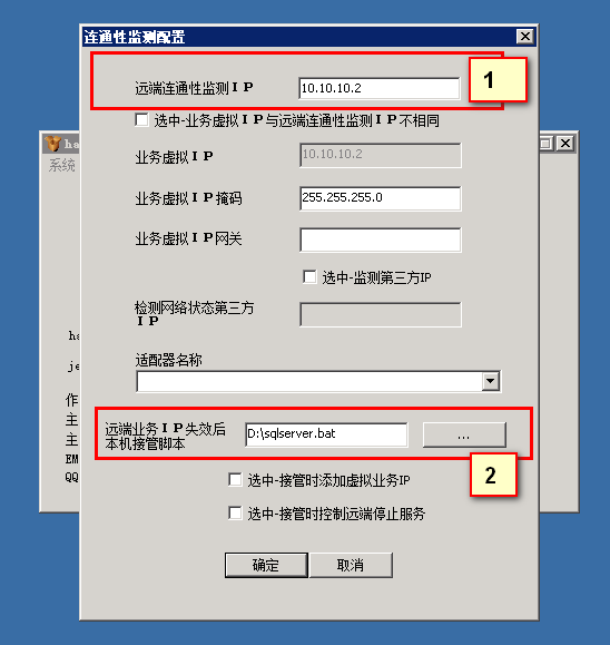 这种情况下,只有用ha比较适合了,从网上找了个免费的ha4win,配置了心跳ip监听,配置启动脚本,切换延迟大概在50秒左右