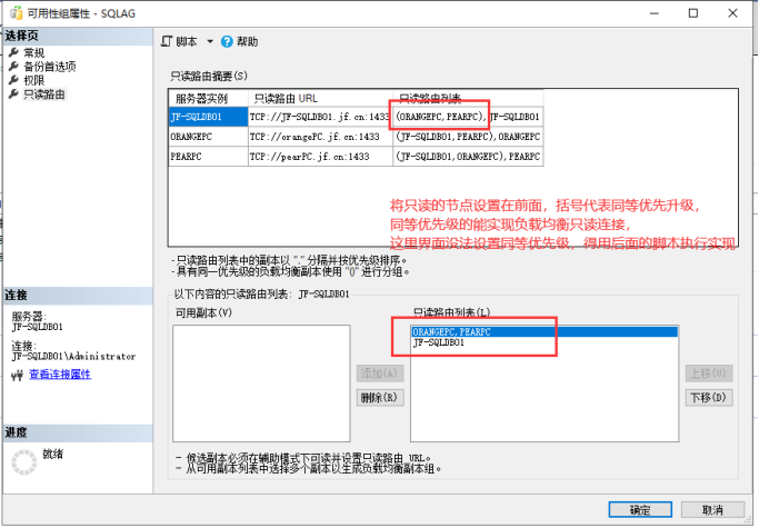 MODIFY REPLICA ON N'JF-SQLDB01' WITH (PRIMARY_ROLE(READ_ONLY_ROUTING_LIST = ((N'PEARPC',N'ORANGEPC'),N'JF-SQLDB01')))