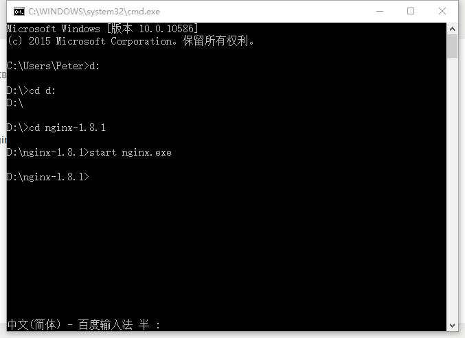进入window的cmd窗口,输入如下图所示的命令,进入到nginx目录(D:/nginx-1.8.1),使用“start nginx.exe ”进行nginx的安装,如下图所示:
