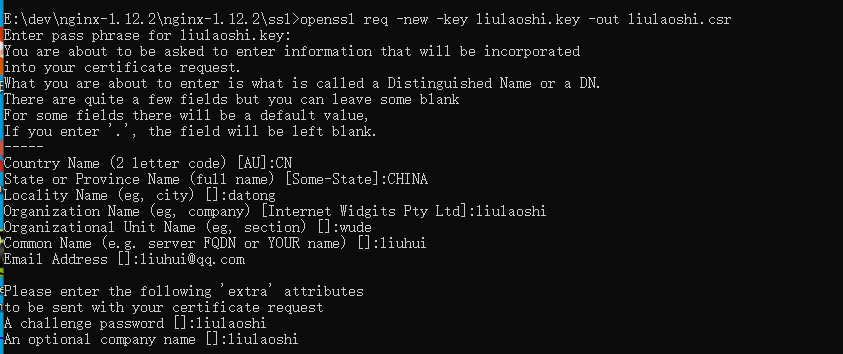 openssl req -new -key liulaoshi.key -out liulaoshi.csr