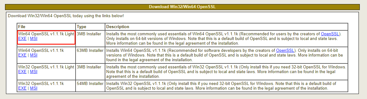 下载OpenSSL http://slproweb.com/products/Win32OpenSSL.html