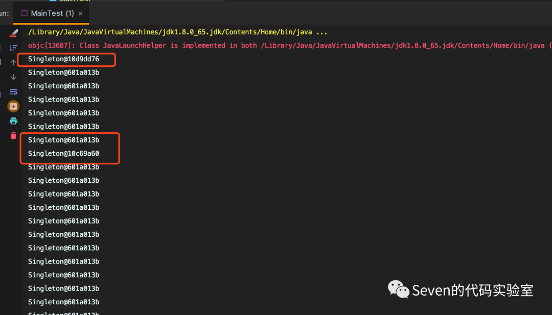 稍微学过多线程的同学就会发现饿汉式单例在多线程环境下有问题,可能会创建出多个对象来,就违背了单例模式的定义了,我们来实验一下: