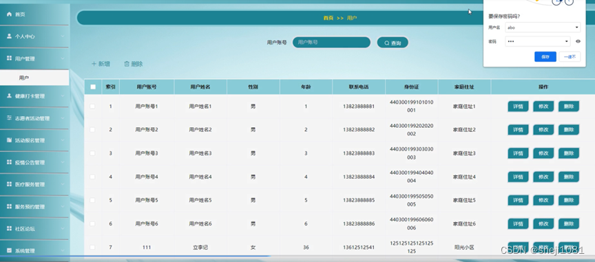 用户管理;在用户管理页面可以对索引、用户账号、用户姓名、性别、年龄、联系电话、身份证、家庭住址等内容进行详情、修改或删除等操作,如图5-9所示。