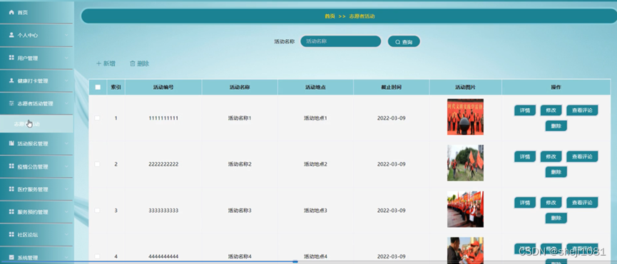 志愿者活动管理;在志愿者活动管理页面可以对索引、活动编号、活动名称、活动地点、截至时间、活动图片等内容进行详情、修改、查看评论或删除等操作,如图5-11所示。