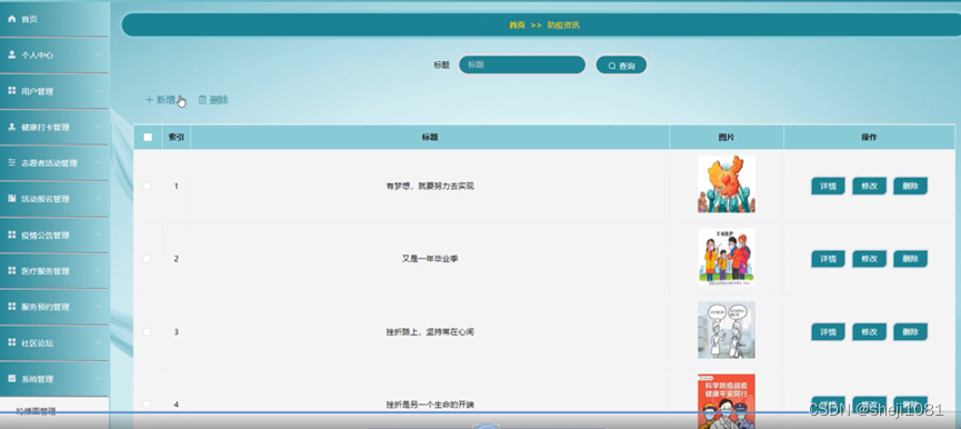 系统管理,在防疫资讯页面中可以对索引、标题、图片等内容进行详情、修改或删除等操作,并可以根据轮播图管理进行相应的操作,如图5-17所示。