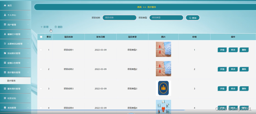 医疗预约管理;在医疗预约管理页面可以对索引、项目名称 、发布日期、项目类型、图片、价格等内容进行详情、修改或删除等操作,如图5-14所示。