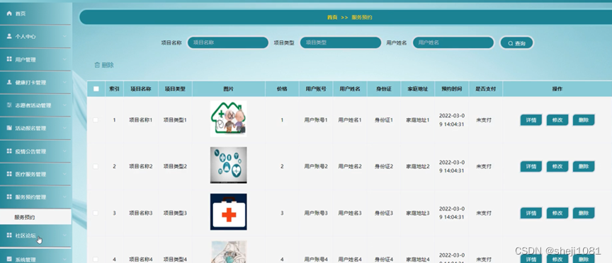 服务预约管理;在服务预约管理页面可以对索引、项目名称 、项目类型、图片、价格、用户账号、用户姓名、身份证、家庭住址、预约时间、是否支付等内容进行详情、修改或删除等操作,如图5-15所示。