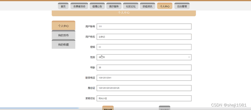 个人中心;在个人中心页面通过填写用户账号、用户姓名、密码、性别、年龄、联系电话、身份证、家庭住址等内容进行更新信息等操作,并可以根据我的发布或我的的收藏进行相应的操作,如图5-7所示。