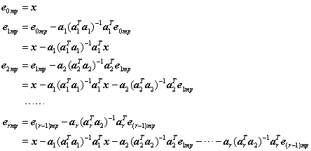 同理,若设MP共从冗余字典中选择了r个原子,分别是a1,a2,……,ar,根据匹配追踪的流程可以知道待分解信号x每次迭代后剩余的残差ermp为