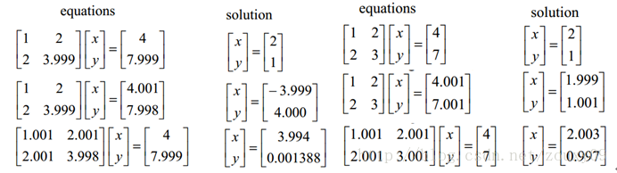 咱们先看左边的那个。第一行假设是我们的AX=b,第二行我们稍微改变下b,得到的x和没改变前的差别很大,看到吧。第三行我们稍微改变下系数矩阵A,可以看到结果的变化也很大。换句话来说,这个系统的解对系数矩阵A或者b太敏感了。又因为一般我们的系数矩阵A和b是从实验数据里面估计得到的,所以它是存在误差的,如果我们的系统对这个误差是可以容忍的就还好,但系统对这个误差太敏感了,以至于我们的解的误差更大,那这个解就太不靠谱了。所以这个方程组系统就是ill-conditioned病态的,不正常的,不稳定的,有问题的,哈哈。这清楚了吧。右边那个就叫well-condition的系统了。