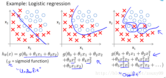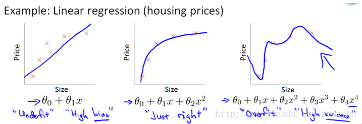 除了L1范数,还有一种更受宠幸的规则化范数是L2范数: ||W||2。它也不逊于L1范数,它有两个美称,在回归里面,有人把有它的回归叫“岭回归”(Ridge Regression),有人也叫它“权值衰减weight decay”。这用的很多吧,因为它的强大功效是改善机器学习里面一个非常重要的问题:过拟合。至于过拟合是什么,上面也解释了,就是模型训练时候的误差很小,但在测试的时候误差很大,也就是我们的模型复杂到可以拟合到我们的所有训练样本了,但在实际预测新的样本的时候,糟糕的一塌糊涂。通俗的讲就是应试能力很强,实际应用能力很差。擅长背诵知识,却不懂得灵活利用知识。例如下图所示(来自Ng的course):