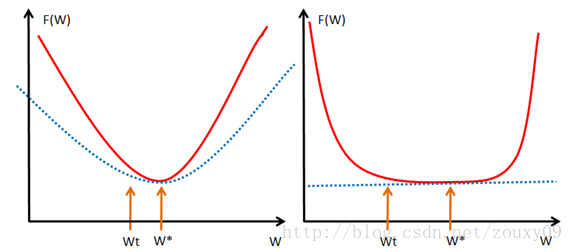 大家一看到上面这个图就全明白了吧。不用我啰嗦了吧。还是啰嗦一下吧。我们取我们的最优解w*的地方。如果我们的函数f(w),见左图,也就是红色那个函数,都会位于蓝色虚线的那根二次函数之上,这样就算wt和w*离的比较近的时候,f(wt)和f(w*)的值差别还是挺大的,也就是会保证在我们的最优解w*附近的时候,还存在较大的梯度值,这样我们才可以在比较少的迭代次数内达到w*。但对于右图,红色的函数f(w)只约束在一个线性的蓝色虚线之上,假设是如右图的很不幸的情况(非常平坦),那在wt还离我们的最优点w*很远的时候,我们的近似梯度(f(wt)-f(w*))/(wt-w*)就已经非常小了,在wt处的近似梯度∂f/∂w就更小了,这样通过梯度下降wt+1=wt-α*(∂f/∂w),我们得到的结果就是w的变化非常缓慢,像蜗牛一样,非常缓慢的向我们的最优点w*爬动,那在有限的迭代时间内,它离我们的最优点还是很远。